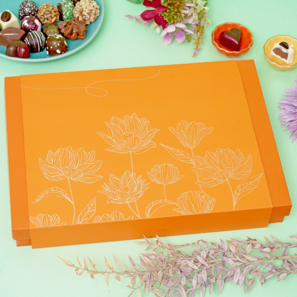 - 24 Assorted Couverture Chocolates - (Hazelnut Truffle, Cranberry Cacao Kiss, Irish Cream, Chai Biskoot, Latte Coffee bean, Hazelnut Rocher, Paan, Almond Truffle, Strawberry Cheesecake, Peanut Salted Caramel, Rosemary Caramel, Almond Rocher, Mint, Hazelnut Feuiletine, Latte Coffee bean, Citrus Noir)