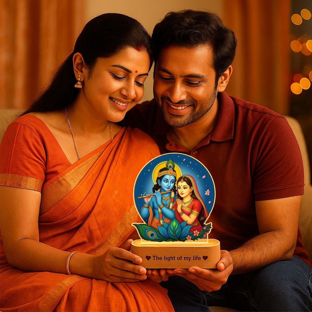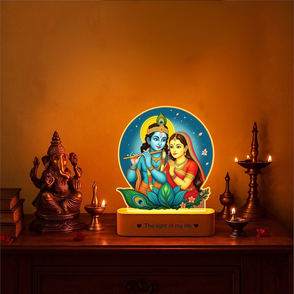 - Divine Design – Intricately engraved Radha Krishna artwork illuminated with a soothing LED glow
