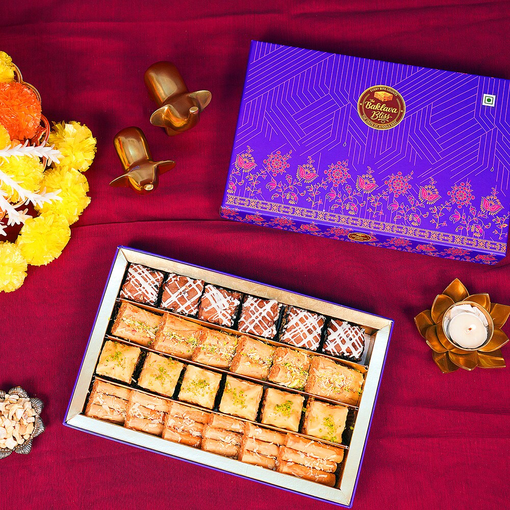 • A luxurious assortment of handcrafted delights, our The Grandeur Collection Gift Box features the crisp layers of Lady Finger Baklava, the rich indulgence of Mixed Dry Fruit Baklava, the nutty charm of Almond Barma, and the decadent sweetness of Cashew Chocolate Baklava
