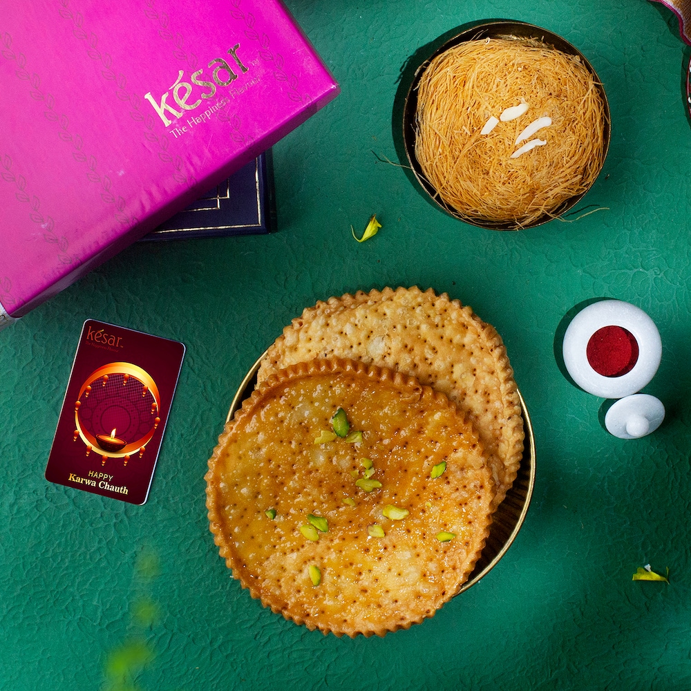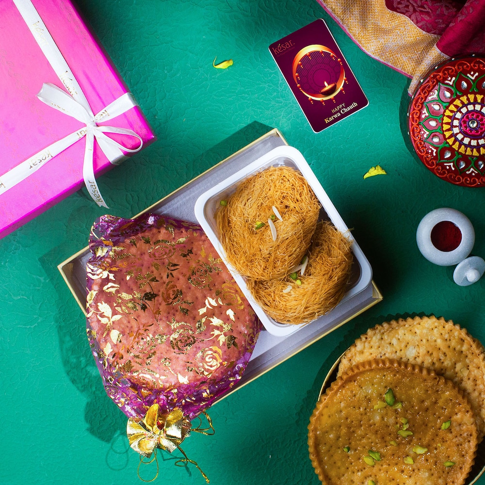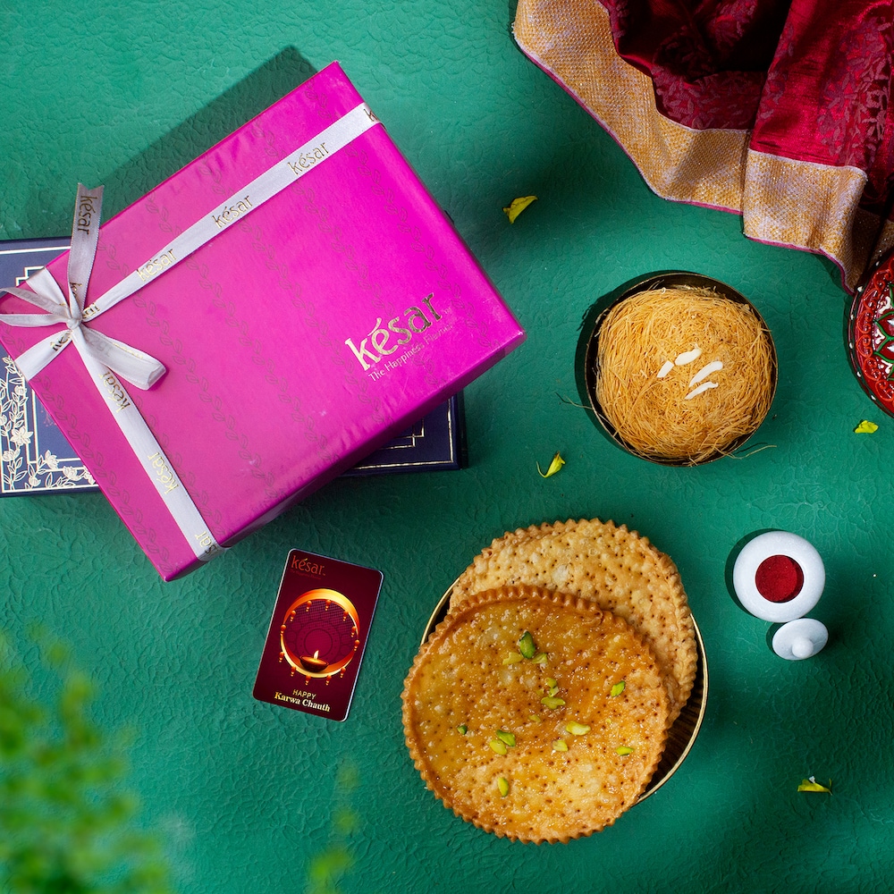 - Sargi Box - Pink Gift Box with 100gm Desi Ghee Finni and mitthi and fikki mathri packed together in a fancy potli
